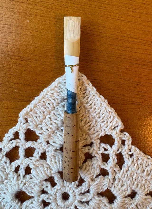 オーボエ 完成リード KlangA (クラング アー)S ケーン:グロタンBM チューブ:グロタン ブラス 47mm 全長:72mm スクレープ:10.5mm 糸の色:水色 中位の重さの吹奏感です。 調整しやすいように、針金と息漏れ防止テープを使っています。